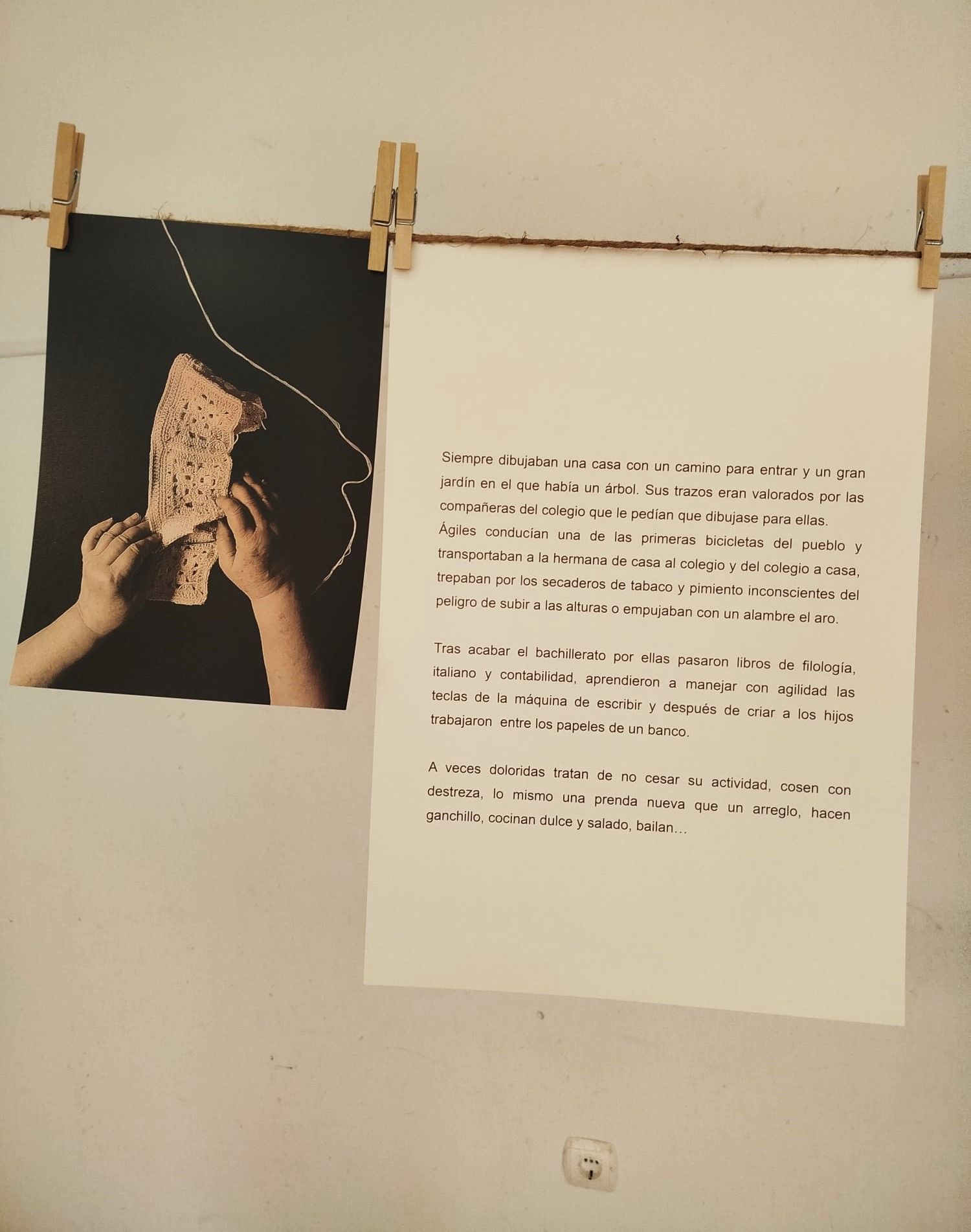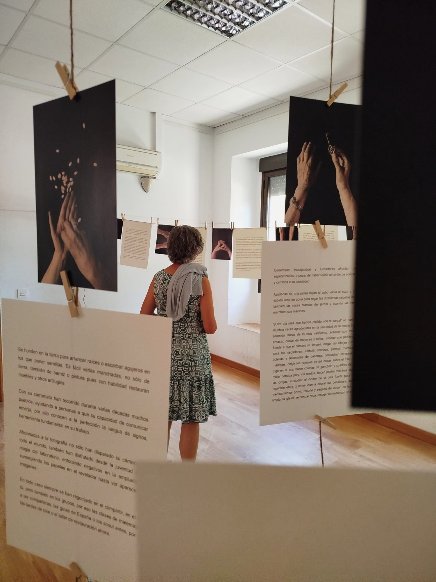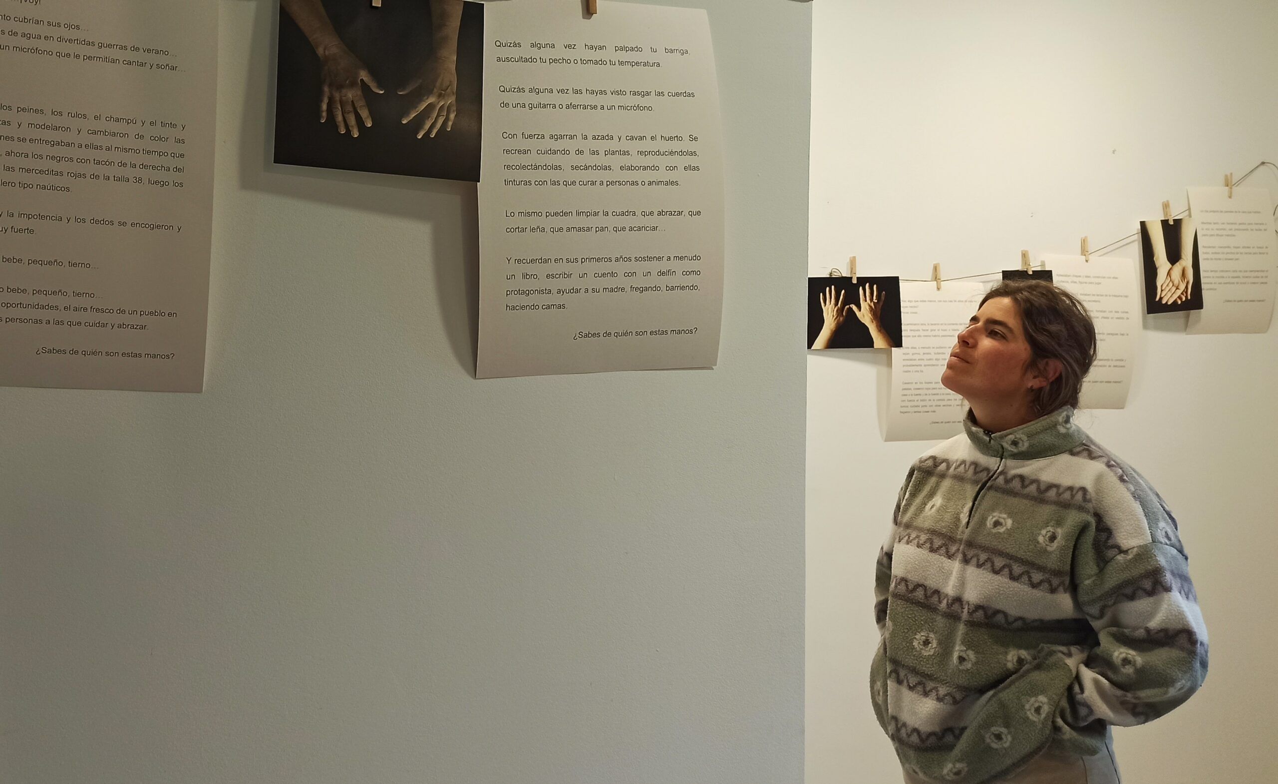 El proceso parte de una entrevista íntima con cada una de las mujeres para poder conocer sus historias de vida, poniendo el foco en sus manos, en los diferentes trabajos que han desarrollado, en los juegos de los que han sido cómplices, en las pieles que han acariciado, en las herramientas que han sostenido, en los cuidados que han brindado…Con sus testimonios como insumo y sus manos como protagonistas elaboro diferentes materiales, desde reproducciones de sus manos en escayola a retratos fotográficos pasando por textos inspirados en sus biografías que pasan a formar parte de instalaciones o propuestas expositivas situadas en las mismas poblaciones.